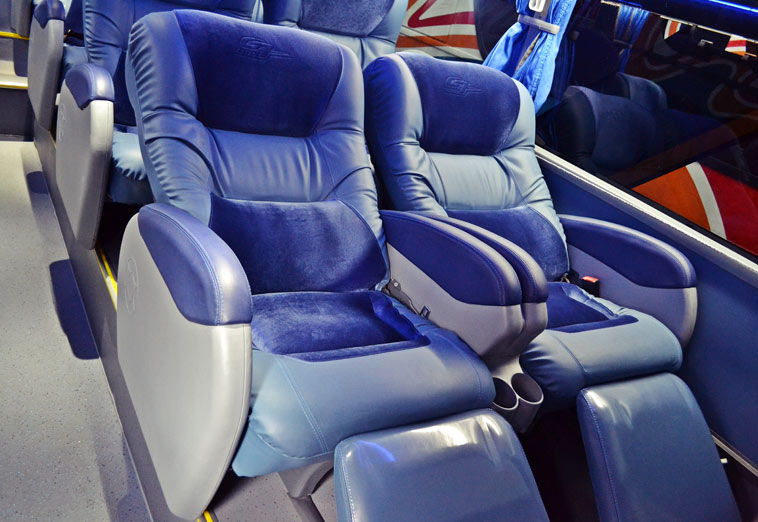 A distribuição de assentos no andar superior 1 x 1 x 1 e 2 x 1 no andar de baixo.